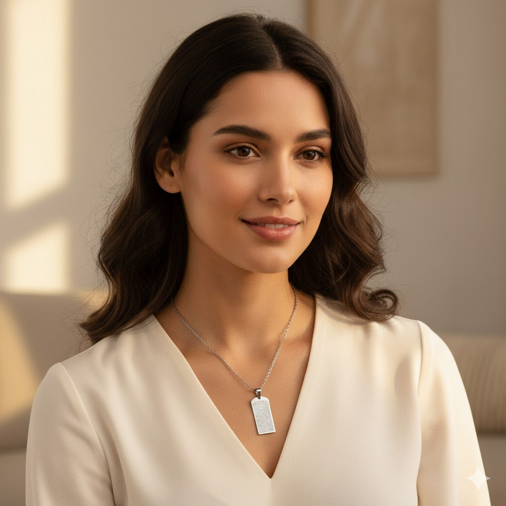 Sa forme rectangulaire raffinée associée à des détails minutieux crée un bijou intemporel, à la fois discret et profondément symbolique. Que ce soit pour vous ou pour offrir, ce collier représente bien plus qu’un simple accessoire : c’est un porte-bonheur, une source d’inspiration et un bijou unique chargé d’émotions.