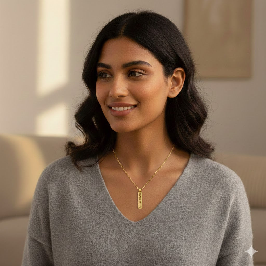 Ce pendentif rectangulaire est orné d’une calligraphie arabe finement gravée, offrant un rappel spirituel constant et porteur de paix intérieure. Sa forme sobre et élégante symbolise la stabilité, la force et la constance, accompagnant son porteur dans les moments importants de la vie.